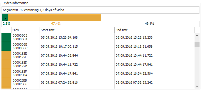 The bar graph for segments shows quota of free disk space (white), continuous recordings (orange) and triggered recordings (green). The corresponding percentage is shown below the bar graph.