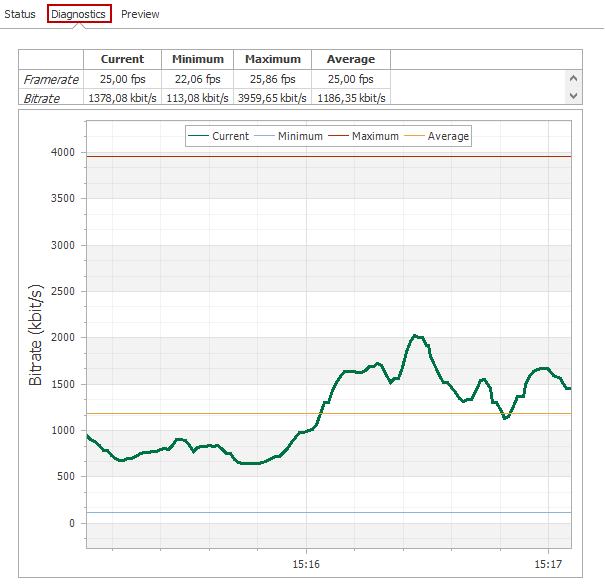 The Diagnostics tab provides information about the camera as well as frame and bit rates. A trend view shows the bit rate trend over the last two minutes.