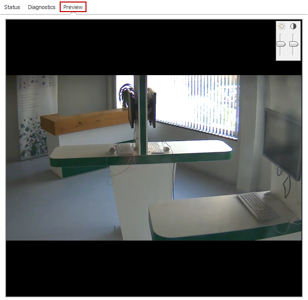 The Preview tab provides a preview of the camera. If you move the mouse over the top right corner of the preview window, two sliders appear for adjusting contrast and brightness of the camera.