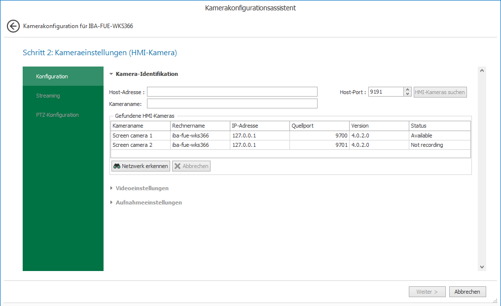 In Schritt 2 der Kamerakonfiguration können Sie Einstellungen für die einzelnen HMI-Kameras vornehmen.