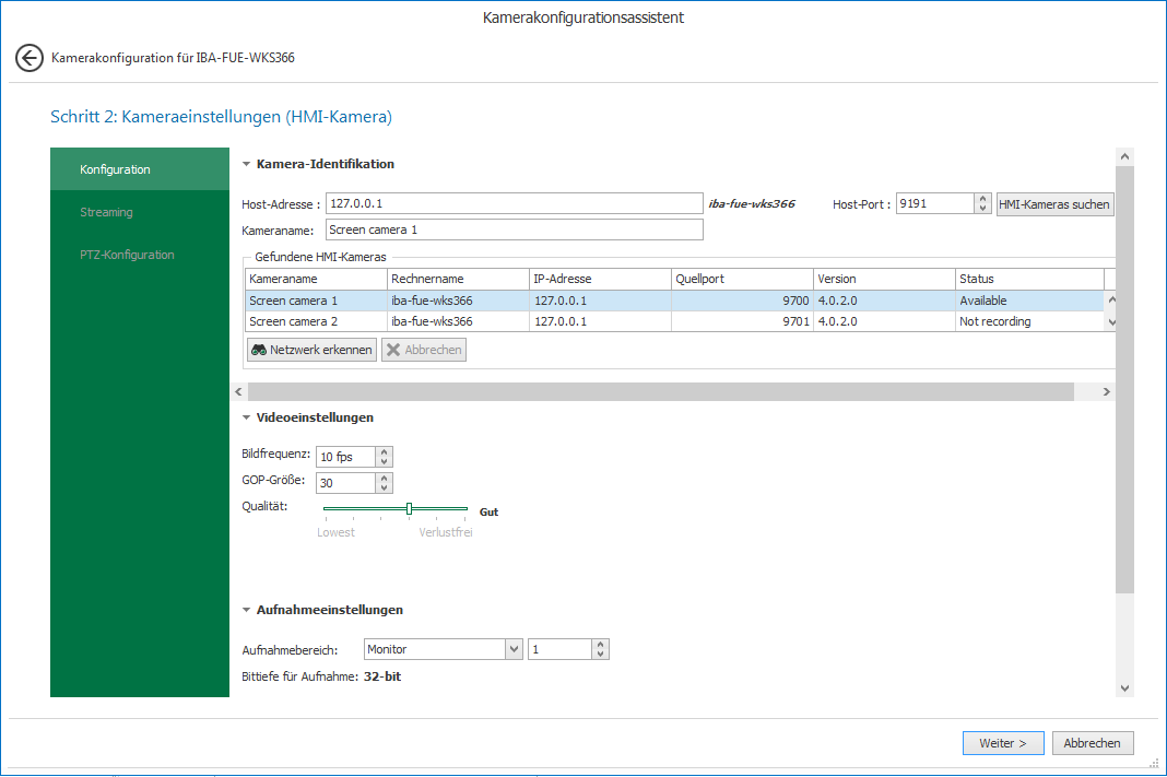 „Kameraname" ist der Kameraname der in ibaCapture-ScreenCam konfiguriert wurde