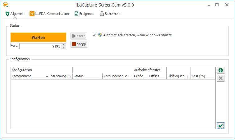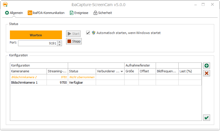 Mit den Buttons <Start> und <Stop> können Sie das Programm starten und anhalten. Die Portnummer sollte nur bei speziellen Konfigurationen geändert werden. Wenn die Option Automatisch starten, wenn Windows startet aktiviert ist, startet das Programm ibaCapture-ScreenCam automatisch, wenn Sie sich bei Windows anmelden.