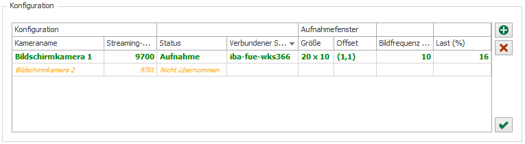 ) und konfigurieren den Aufzeichnungsbereich und die Bildrate im ibaCapture-Manager, siehe Kapitel Konfiguration in ibaCapture-Manager. Wenn die Konfiguration im ibaCapture-Manager vorgenommen wurde, werden zusätzliche Informationen in der Tabelle angezeigt.