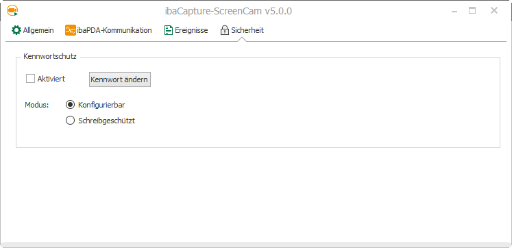 Sobald ein Passwort eingegeben wurde, erscheint im Kontrollkästchen "Aktiviert" ein Häkchen. Dann funktioniert die Aufzeichnung eines Bildschirms von diesem System nur nach Eingabe des richtigen Kennworts. Auch die ibaCapture-ScreenCam-Instanz kann nur noch durch Eingabe des richtigen Kennworts beendet werden.