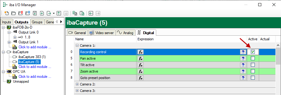 For each configured ibaCapture module, i.e. for each ibaCapture Server, there is also a module in this section. For each camera, you can define a digital signal or a boolean expression to control the video recording of the corresponding camera. If the expression is 'true', the recording is enabled or disabled according to the selected camera recording mode.