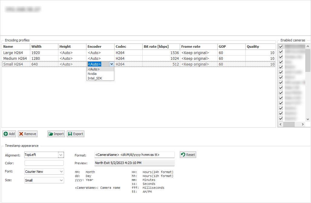 Mehrere Kodierungsprofile mit unterschiedlichen Bildgrößen sind bereits voreingestellt (Large H264, Medium H264, Small H264):