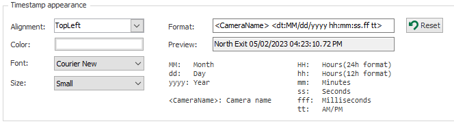 Im folgenden Beispiel wird die Variable "<CameraName>" bei der Kodierung durch den tatsächlichen Kameranamen ersetzt. Die Variable "<dt:(...)>" wird durch den formatierten Zeitstempel ersetzt.