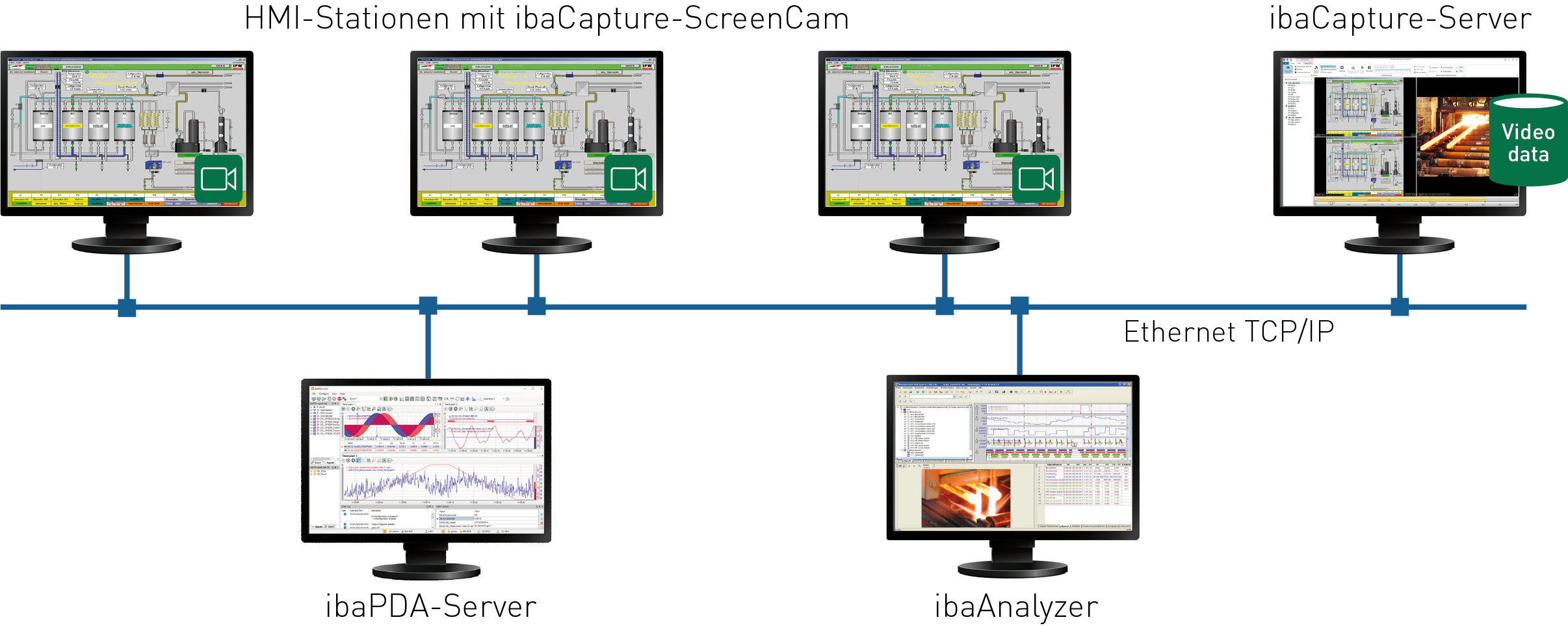 Alle Computerbildschirme, die unter Windows laufen (mindestens .Net 4.0), können erfasst werden. Auf den Rechnern muss das Programm ibaCapture-ScreenCam installiert sein. Die Rechner müssen via TCP/IP mit dem ibaCapture-Server verbunden sein.