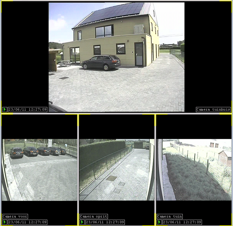 Für weitere Aktionen können die gewünschten Kameras ausgewählt werden. Wenn eine Kameraansicht nur eine einzige Kamera enthält, dann ist diese Kamera immer ausgewählt. Wenn mehrere Kameras in einer Kameraansicht enthalten sind, dann müssen Sie nur auf das Kamerabild klicken, um die entsprechende Kamera auszuwählen. Gelbe Markierungen in den Ecken zeigen an, welche Kamera ausgewählt ist (sind). Sollen mehrere Kameras ausgewählt werden, halten Sie die Taste <Strg> oder <Umsch> gedrückt und klicken dann nacheinander auf die betreffenden Kamerafenster. Um eine einzelne Kamera aus einer Mehrfachauswahl wieder heraus zu nehmen, drücken Sie die Taste <Strg> und klicken auf das betreffende Kamerafenster.
