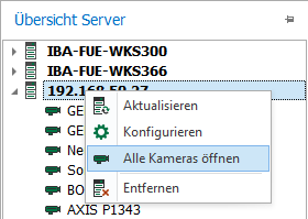 Wenn Sie alle aktiven Kameras eines ausgewählten ibaCapture-Servers zur Kameraansicht hinzufügen möchten, öffnen Sie das Kontextmenü des Servers und wählen "Alle Kameras öffnen".