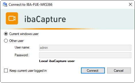 opens the login dialog. The header of the dialog shows the name of the ibaCapture Server you login to.