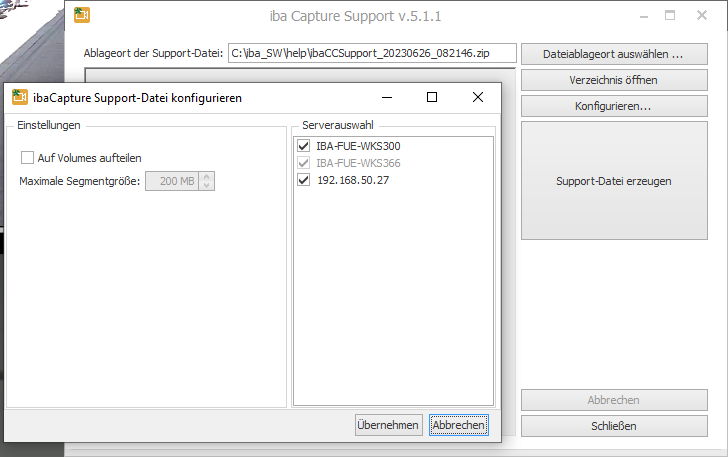 Sie können den Ablageort der Datei auswählen und das angegebene Verzeichnis öffnen. Mit der Schaltfläche <Konfigurieren> öffnen Sie einen Dialog, in dem Sie ibaCapture-Server auswählen können, mit denen ibaCapture-Manager verbunden ist und für die eine Support-Datei erzeugt werden soll.