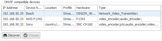 As ONVIF compatible devices support an automatic detection, the easiest way is to click on the <Discover> button. A list of all detected, active ONVIF compatible cameras will be shown.