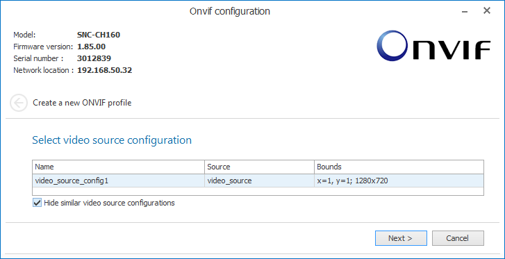 First, select a source profile. The video sources are permanently stored in the respective ONVIF device and cannot be changed. If the option "Hide similar video source configurations" is checked, the assistant attempts to reasonably narrow down the available video sources, e.g. when the same video source is listed multiple times. A camera usually has only one video source. Afterwards, click <Next>.