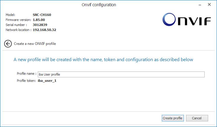 In the third step, you confirm your selection. The properties of the profile will be shown again. Enter a name for your new ONVIF profile. The token at the end is an internal ID for the profile and will be assigned automatically. Complete the creation of the new profile by pressing <Create profile>.