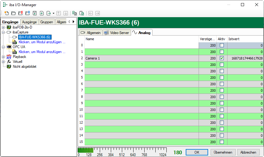 Damit die Synchronisationsdaten einer Kamera in der Messdatei gespeichert werden und somit die Video- mit der Messdatenaufzeichnung verknüpft wird, muss das Häkchen in der Spalte Aktiv gesetzt werden. Dementsprechend zeigt ibaAnalyzer die Kamera im Signalbaum, wenn die Messdatei zu Analysezwecken geöffnet wird. Wenn dann in ibaAnalyzer ein Doppelklick auf das Kamerasymbol gemacht wird, werden auf Basis dieser Synchronisationsinformationen die Videosequenzen aus dem Speicher des ibaCapture-Servers geladen.