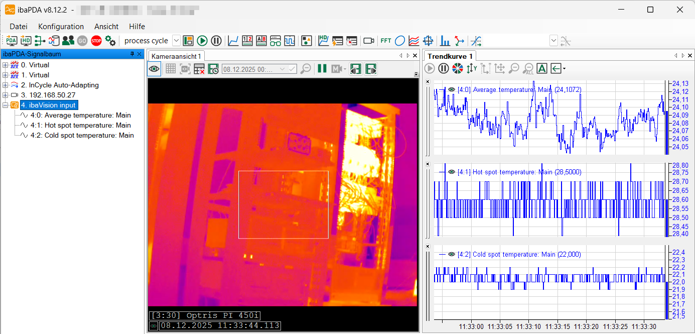 Das Bild der Optris-Wärmebildkamera wird im ibaPDA-Client in einer Kameraansicht angezeigt, die Temperaturwerte erscheinen als analoge Signale im Signalbaum und können in einer Trendkurve angezeigt werden.
