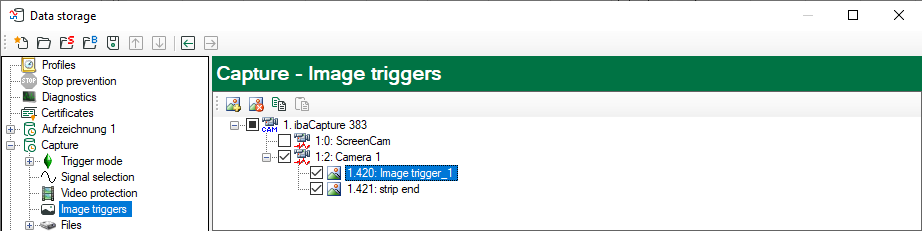 Similar to video triggers (see above), image triggers are defined in the data storage configuration of ibaPDA (version 6.29.0 or higher). A branch "Image trigger" can be seen in the tree of data storage if ibaCapture modules are included in the I/O configuration.