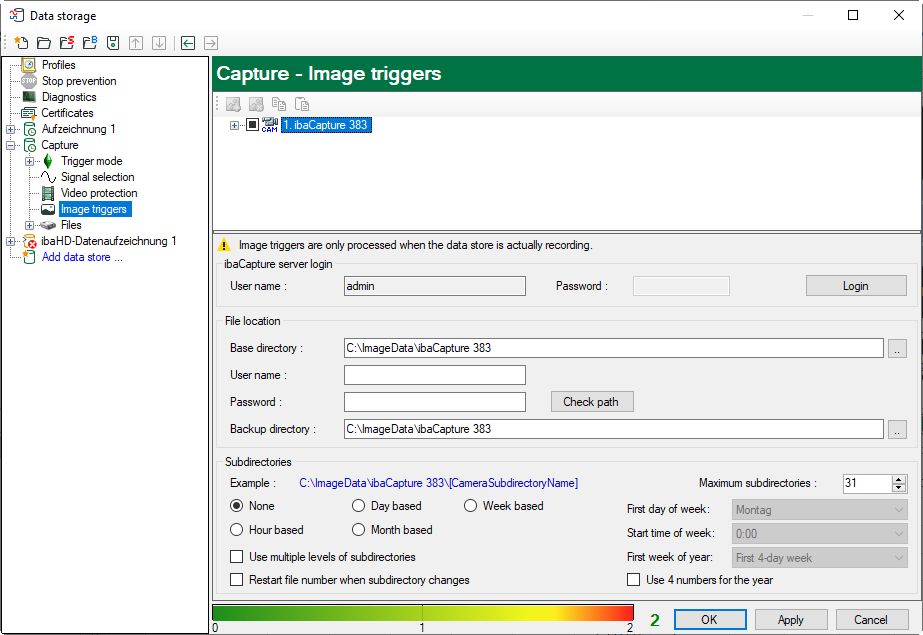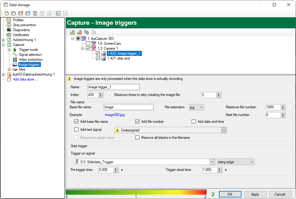 The configuration of the image triggers is done on 3 different levels: ibaCapture Server, camera and image trigger.