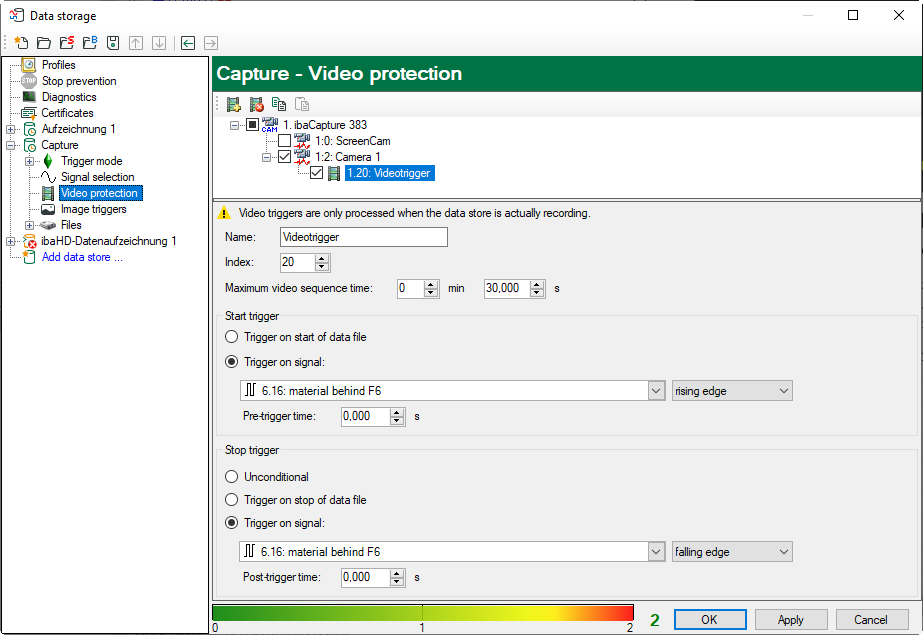 Parallel to the continuous video recording, triggered video sequences can be recorded. As described in chapter "Principles of video recording", particular video sequences are stored protected on ibaCapture Server by means of video triggers during video recording to protect the video data against being overwritten by the continuous recording.