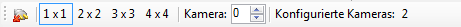 Im Anzeigebereich können maximal 16 Kamerabilder gleichzeitig angezeigt werden. Durch die Darstellung als Kachelmuster werden die Kamerabilder deutlich verkleinert dargestellt. Eine Möglichkeit der größeren Darstellung bietet das Eingabefeld "Kamera". Sind acht Kameras angeschlossen und es sollen aber nur vier Kamerabilder gleichzeitig angezeigt werden, dann öffnen Sie die Ansicht 2x2 durch einen Mausklick in der Symbolleiste. Es werden jetzt die Kameras 1 bis 4 angezeigt. Durch einen Mausklick auf den "Pfeil nach oben" werden die nächsten vier Kamerabilder angezeigt. Automatisch springt die Kameranummer von 0 (für die erste Kamera) auf die Nummer 4 (für die fünfte Kamera). Durch einen Mausklick auf den "Pfeil nach unten" werden wieder die Kamerabilder der ersten vier Kameras angezeigt.