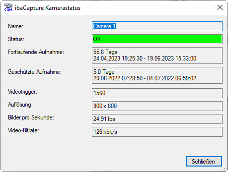 Der ibaCapture-Kamerastatus zeigt nützliche Informationen zur Kamera (z. B. Status, Aufnahmezeit, Anzahl der Video-Trigger, Auflösung und Bitrate).
