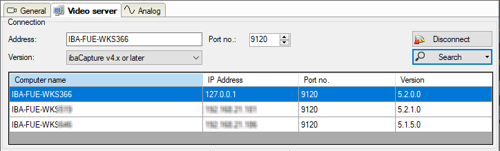 The server in question should then be selected with a mouse click. Click the <Connect> button to connect to the ibaCapture Server. The selected server is shown in the Address field.