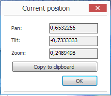 Show current position data: shows the absolute pan, tilt and zoom values of the current camera position. By clicking on <Copy to clipboard>, the data can be copied and, if required, inserted as absolute position in "Absolute move" of the "PTZ" tab of the ibaCapture configuration. For insertion, place the mouse pointer on one of the input fields and press the key combination <Ctrl> + <V>.
