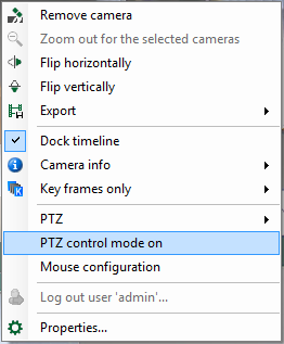 For the PTZ camera to be controllable with the mouse, the PTZ control mode needs to be activated. For this purpose, select PTZ control mode on in the camera context menu or click with the middle mouse button or the setting wheel. Do the same for deactivation.