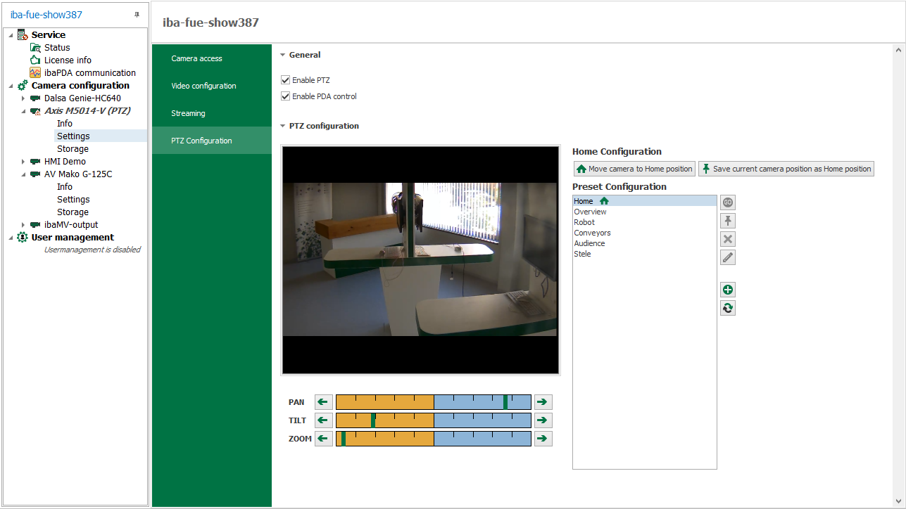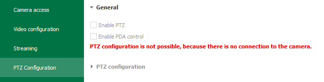PTZ is disabled for all new cameras by default. For activation, the checkmark must be set and the server configuration applied. |
