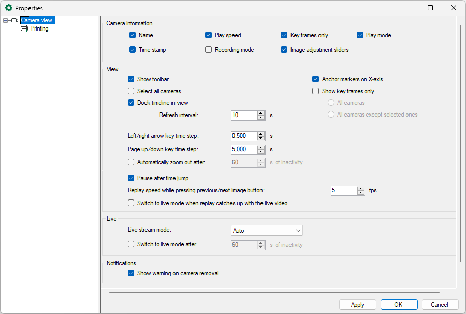 You can also make settings in the Properties dialog. You open the dialog by opening the context menu in a camera view with the right mouse button and selecting Properties.