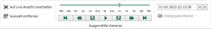 Die Wiedergabegeschwindigkeit nach dem Zeitsprung kann mit dem Geschwindigkeitsregler eingestellt werden. Diese Funktion steht nur dann zur Verfügung, wenn sich die ausgewählten Kameras im Wiedergabemodus befinden.