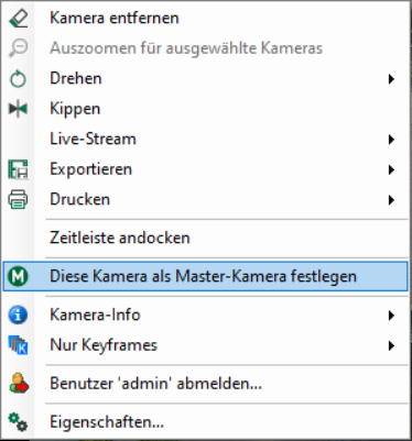 Alternativ dazu kann eine Kamera als Wiedergabe-Master konfiguriert werden, indem Sie in der Kameraansicht, die der Master werden soll, das Kontextmenü mit der rechten Maustaste öffnen und Diese Kamera als Master-Kamera festlegen auswählen.