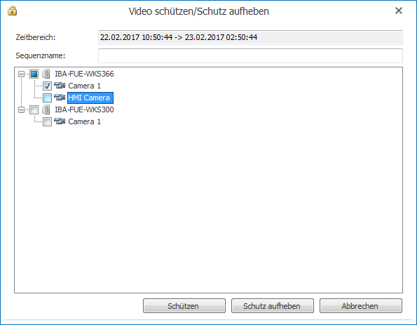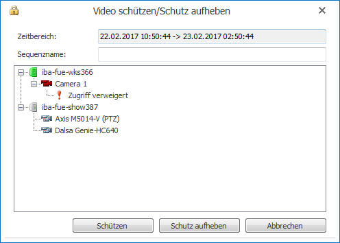 In der Zeile Zeitbereich wird der betreffende Zeitraum entsprechend der Markerpositionen angezeigt. Bei der Funktion "Video schützen" können Sie zusätzlich einen Sequenznamen eingeben.