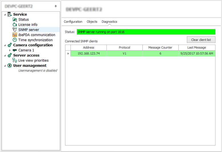There is also a list of all the clients who have accessed the SNMP server within the last hour. Clients who have accessed the SNMP server within the past 10 minutes are highlighted in green and the others in gray.