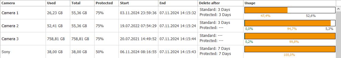 The Storage overview table provides an overview of all configured camera storage on the server. You can find the table in the Storage overview node under Camera configuration.