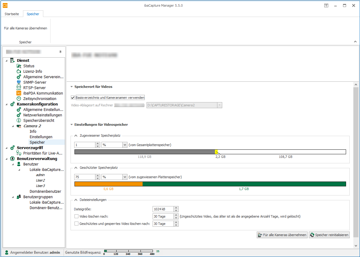 Die gesamte Speicherkapazität für die jeweiligen Kameras wird im Feld Zugewiesener Speicherplatz festgelegt. Der Speicherbereich wird angegeben entweder