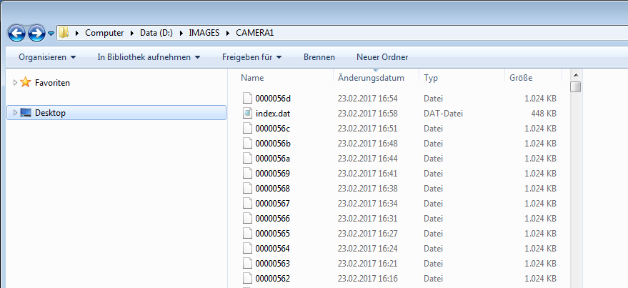 Die Datei "index.dat" ist keine Messdatei im Sinne von ibaPDA (.dat). Es ist eine Indizierungsdatei über alle Videodateien einer Kamera. Es gibt eine Datei index.dat für jede Kamera im entsprechenden Verzeichnis.