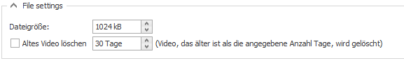 Diese Option dient als Anpassung an die Regelungen, die ein oberes Zeitlimit für die Speicherung von Videomaterial festlegen. Sollte eine solche Regelung existieren, können Sie hier die Option aktivieren und die maximale Speicherzeit festlegen. Alle normalen Videos, die älter sind als die festgelegte Speicherzeit, werden gelöscht.