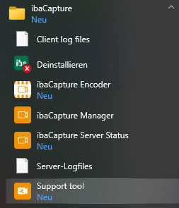 Sie starten das Support-Tool über das Startmenü – Programme – ibaCapture – Support tool.