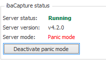 The panic mode can only be deactivated by the admin user by restarting the ibaCapture service. In case the panic mode is active, you can see a button that allows you to disable the mode in the “iba Capture status” field.