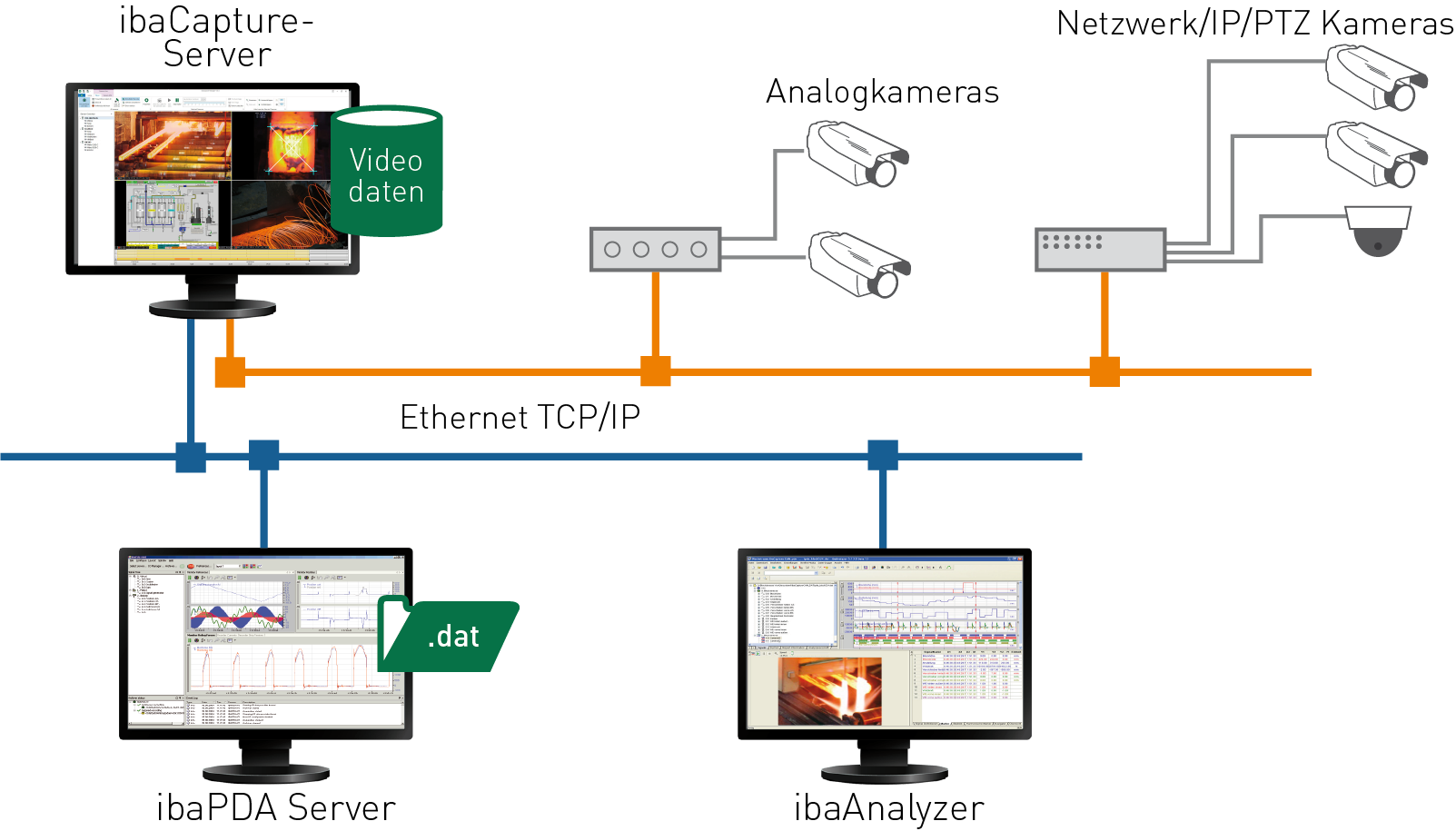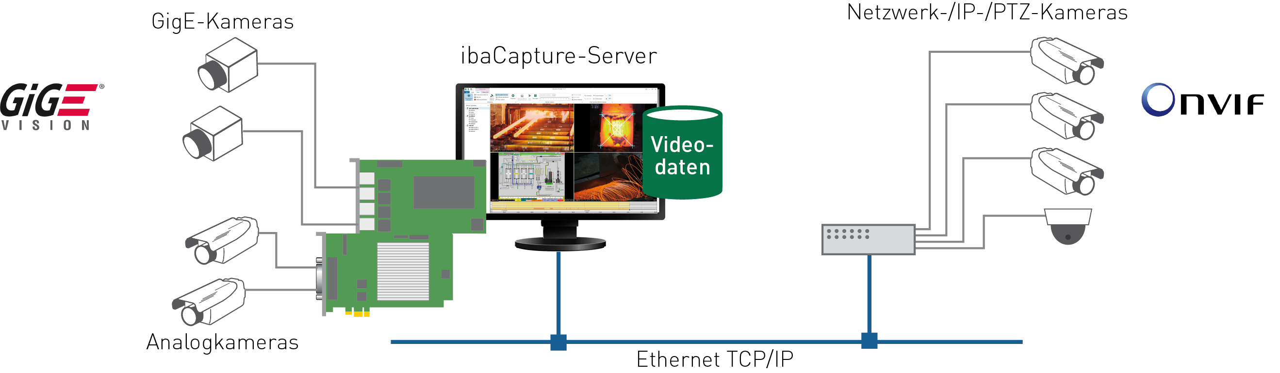 Der Kern eines Video-Aufzeichnungssystems ist der ibaCapture-Server (Rechner). An den ibaCapture-Server können analoge und/oder IP-Kameras angeschlossen werden.