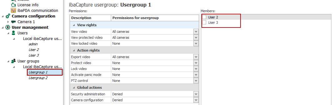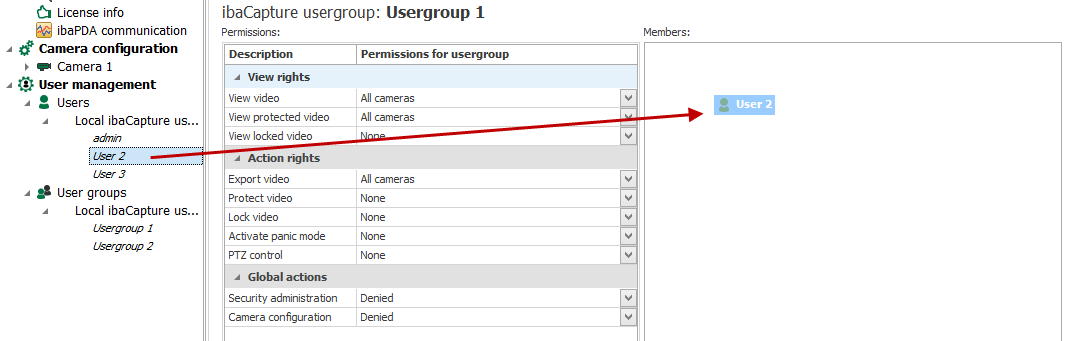 Select a user in the configuration tree, drag the user by keeping the left mouse button depressed and drop the user on the member list of the currently selected user group.
