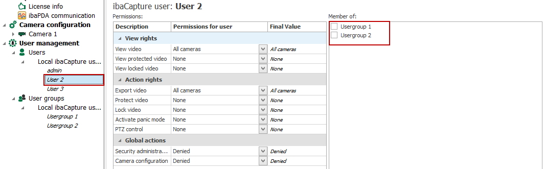 If a user belongs to multiple user groups, the rights of the user group with the most granted permissions will apply to the user.