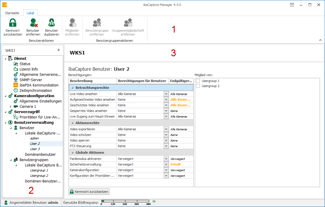 Für den Fall, dass eine Benutzergruppe über mehr Berechtigungen verfügt als ein zugehöriger Benutzer, werden die Berechtigungen des Benutzers durch die Berechtigungen der Benutzergruppe aufgehoben.