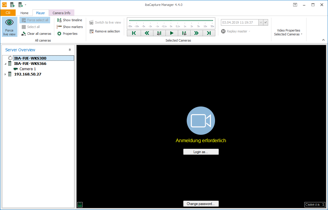 If you have opened multiple camera views in one application that all refer to the same ibaCapture Server, the same login applies to all views. Thus, you need to login to only one camera view. All other views will be logged in with the same login information.