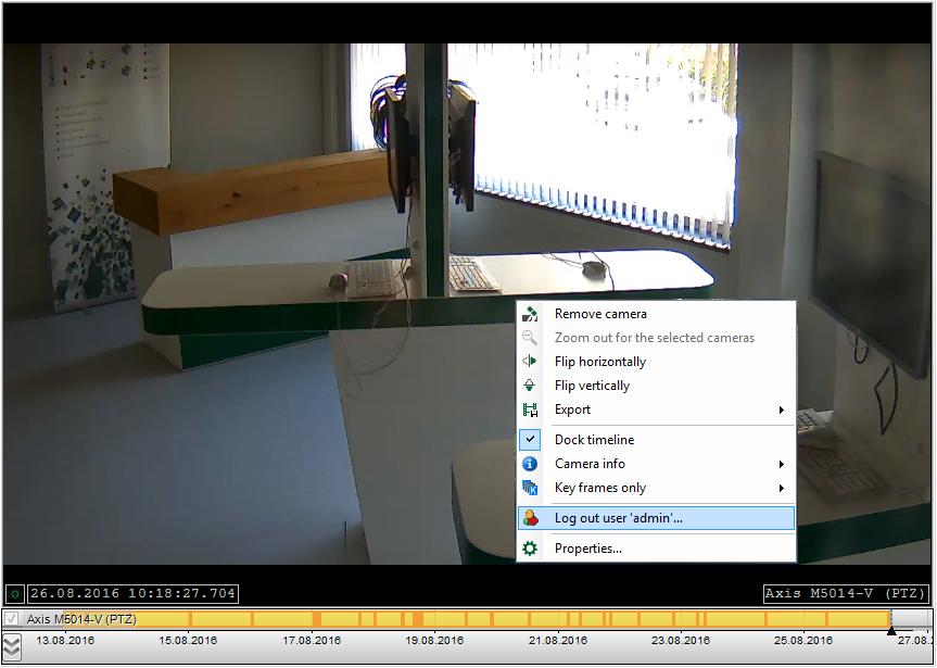 You can logout the current user by opening the context menu of the camera view and selecting "Logout user 'xy'...".