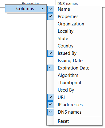 By default, the columns Name, IP Addresses, Properties, DNS names, Issued By, Expiration Date, and URI are displayed.