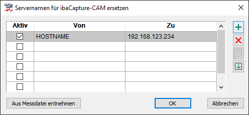 In unserem Beispiel wurde ibaPDA konfiguriert, um sich mit dem ibaCapture-Server "HOSTNAME" zu verbinden. Für den PC, auf dem ibaAnalzyer läuft, ist HOSTNAME im Netzwerk unter Umständen nicht erreichbar. Dafür kann die Adresse 192.168.123.234 erreicht werden. Wenn Sie auf "Aus Messdatei entnehmen" klicken, werden in der Spalte "Von" alle ibaCapture-Server-Namen aufgelistet, die in der aktuell geöffneten Messdatei gespeichert sind.