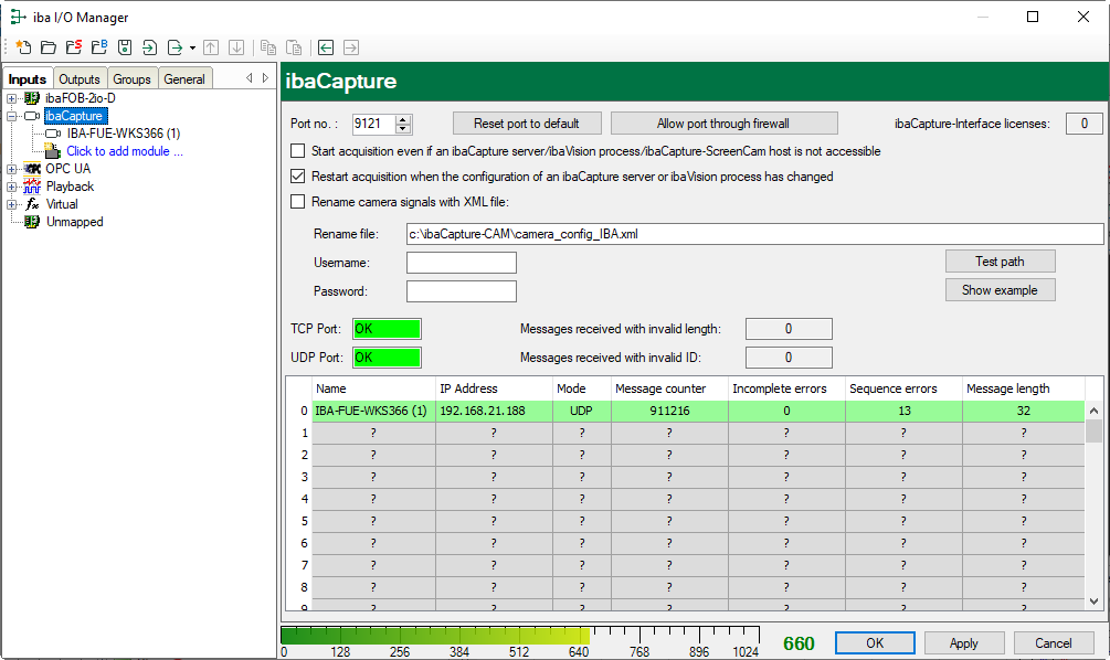 The port number is specified in the entry field in the top left. The port number is used to receive synchronization data from one or more ibaCapture Server via Ethernet connection. The default port number can normally be used.